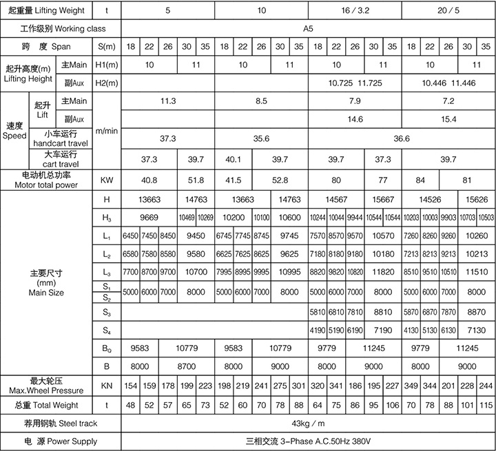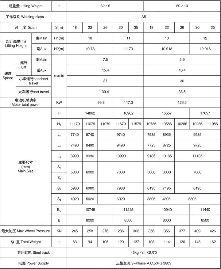 本起重機由橋梁、大車運行機構、小車、電氣設備組成。橋架采用箱形焊接結構,大車運行機構采用分別驅動。全部機構均在操縱室內操縱。起重機導電形式分為電纜和滑觸線兩種,訂貨時任選一種。選用本起重機時須填寫訂貨規范表,須注明使用時工作環境的最低溫度和最高溫度以及電源等。